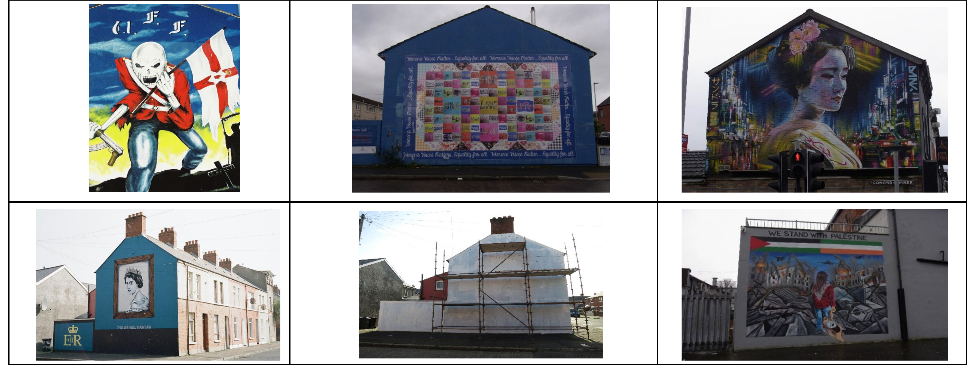 【画像説明】上段左:プロテスタント系武装組織UFF(アルスター自由戦士)のミューラル 上段中央:威嚇的なミューラルが、市主導の「描き替え計画」によって変わった例。左、UFFが「女性の声が大事」に 上段右:2021年、舞妓のミューラルが登場。イングランド出身、キッチナーという絵描きの作品 下段左:エリザベス女王のミューラル(プロテスタント地区)。その後、UDA(アルスター防衛協会)の絵に変わった 下段中央:次の絵を待つ白塗りの状態、